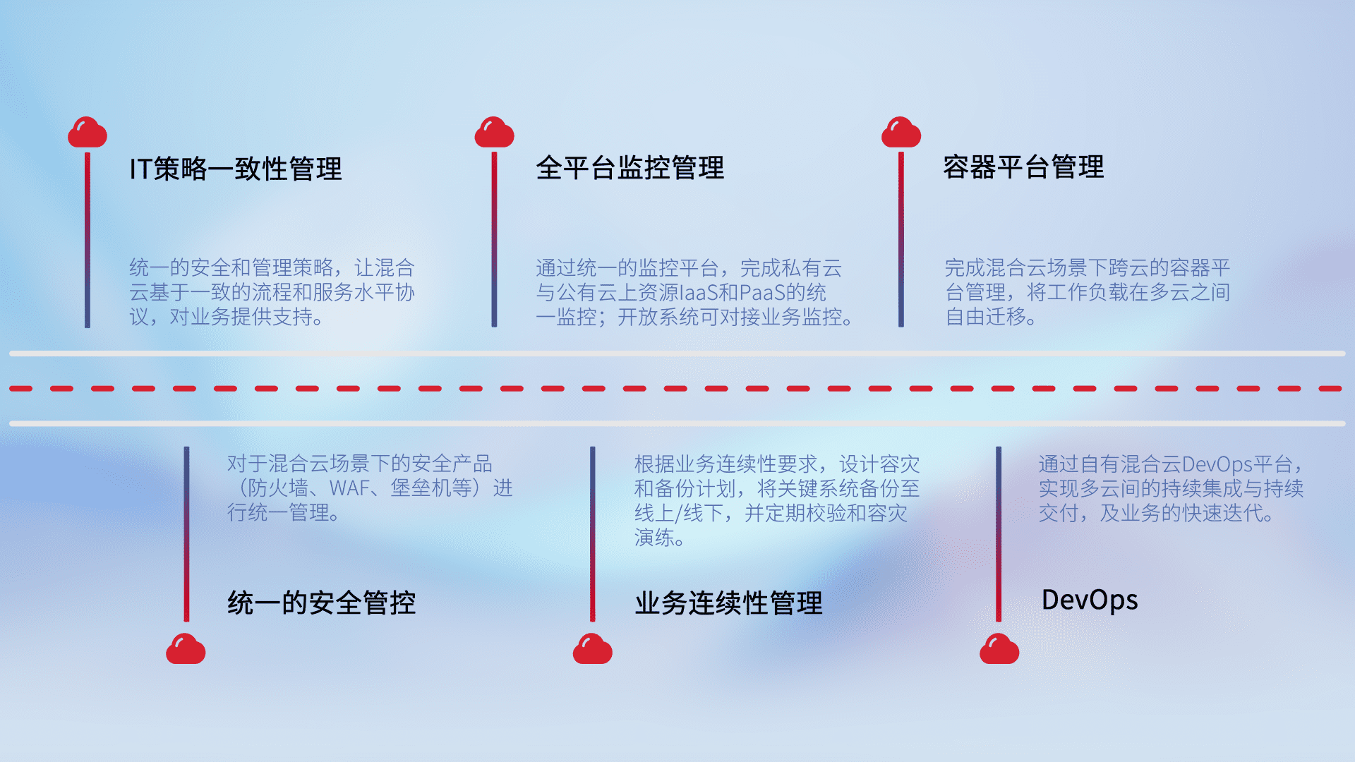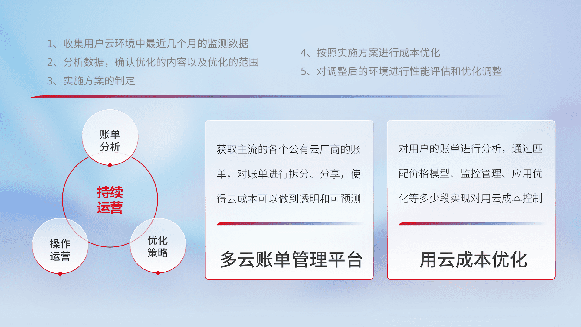 通过多云纳管,,,以统一的资源数据模型把客户的云资源进行抽象和封装,,进而实现对多云资源的统一操作,,保障云资源管理的可靠性、、、稳定性与可用性。。。。量身定制化运维内容,,,,配置、、、开发运维、、、补丁管理、、备份、、监控、、、认证和访问管理、、、审计和日常巡检等,,,保障在用云过程中的可靠度,,稳定度以及高可用率。。。。