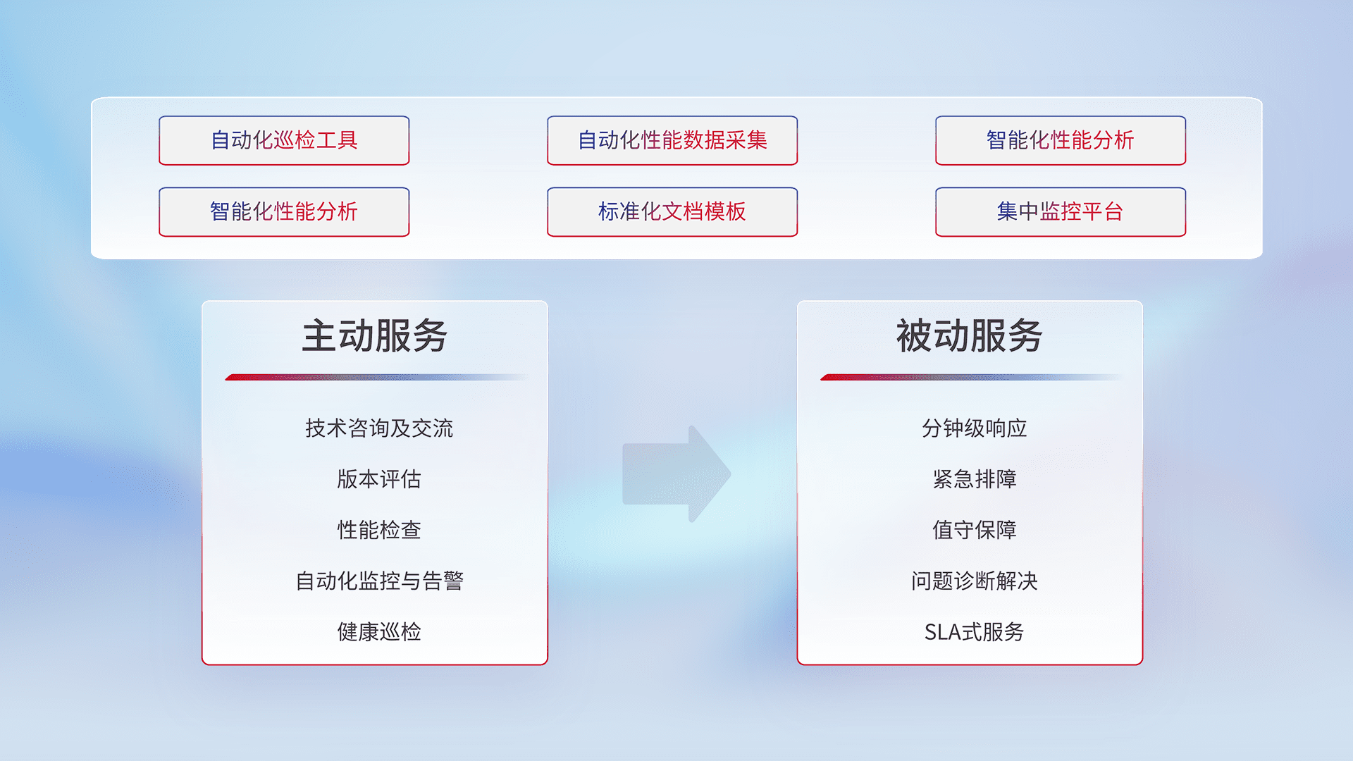 智能化工具和标准化文档,,保障服务质量,,,提供主动服务(包含技术咨询、、、、版本评估、、性能检查、、、自动化监控与告警、、、、健康巡检)和被动服务包含(分钟级响应、、紧急排障、、值守保障、、问题诊断解决、、SLA服务)。。